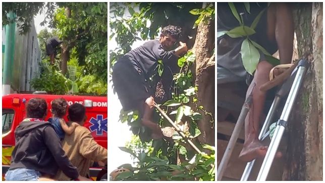 A operação de resgate para tirar o homem de cima da árvore só foi mais dificultoso, porque a zagaia cravada em sua perna, impedia seus movimentos para se aproximar de um dos bombeiros, que estava em uma escada tentando alcancá-lo e finalmente descer com ele.