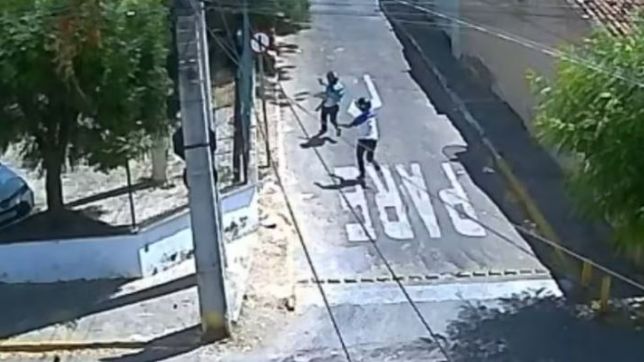 Nas imagens, é possível ver que, imediatamente, um dos jovens cai após ser atingido, enquanto outros correm para longe. Os criminosos também deixam o local correndo e fogem na moto.