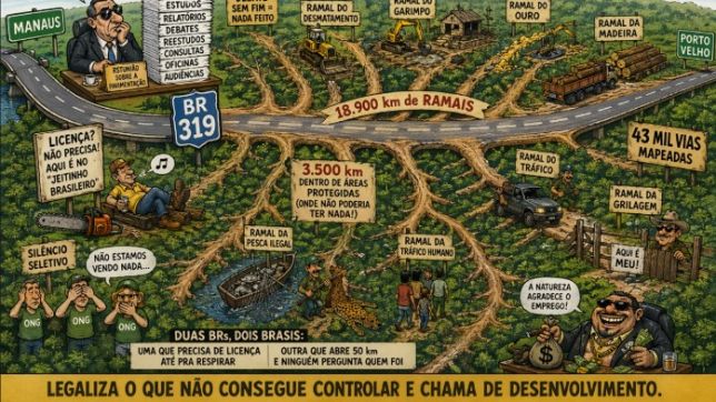 Enquanto isso, a BR-319 clandestina, a BR dos tempos modernos, opera no modo startup: ágil, disruptiva e sem burocracia. Abre ramal no sábado, expande no domingo e na segunda já tem movimento. É como se o país tivesse criado dois modelos de desenvolvimento: um que precisa de licença até pra respirar e outro que desmata, abre estrada e fatura antes do almoço. E curiosamente, o segundo modelo é bem mais eficiente.
