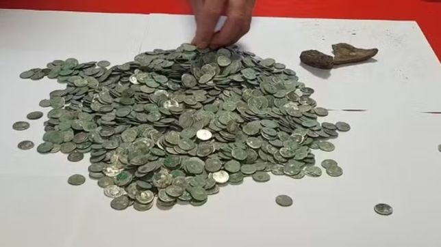 O detector de metais começou a apitar. Ao escavar, Marius se deparou com um verdadeiro tesouro: 1.409 moedas de prata da Roma Antiga.