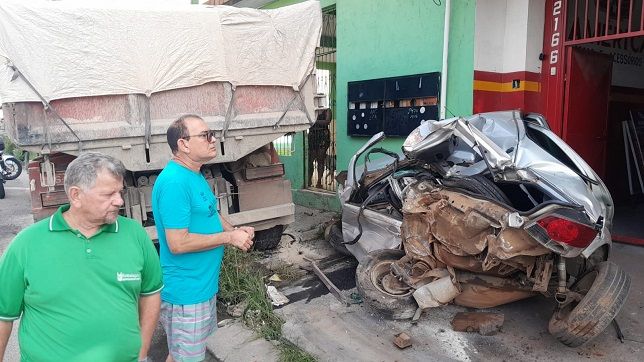 O acidente aconteceu em frente ao Supermercado Coema, no sentido bairro/centro, e o motorista do Fiat Pálio Fire, disse que “nasceu de novo”, porque estava atravessando a pista para entrar no veículo, quando o mesmo foi totalmente destruído.