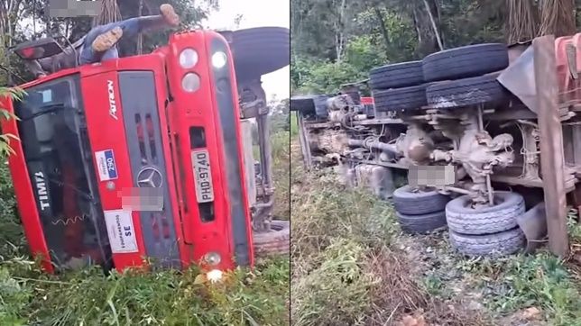 A caçamba de cor vermelha, placa PHD 8740, ficou desgovernada e tombou em um matagal à margem da pista, no quilômetro 76 da rodovia AM-010, que liga Manaus aos municípios de Rio Preto da Eva e Itacoatiara.
