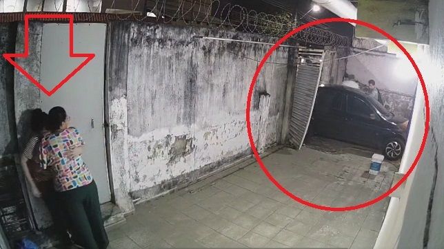 As imagens da câmera de segurança mostram o momento que o marido está guardando o veículo, a esposa está fechando o portão da garagem e são surpreendidos pelo criminoso.