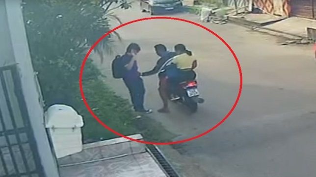 Momento que o homem e a mulher abordam e roubam o celular do estudante que estava a caminho da escola