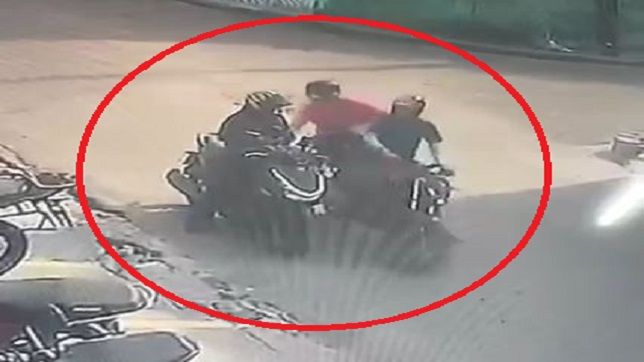 Momento que os dois bandidos se aproximam em outra motocicleta e fazem o assalto em plena luz do dia