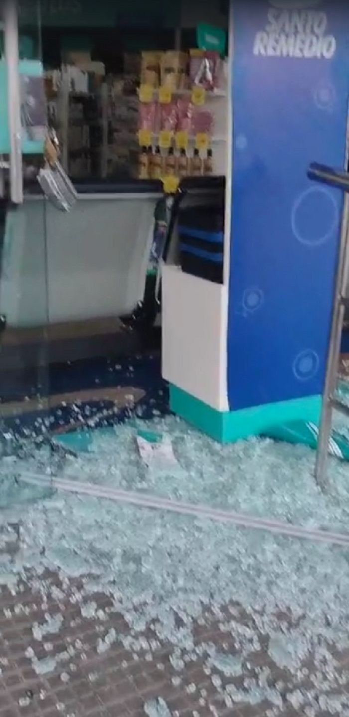 No vídeo que já foi publicado nas redes sociais e em vários grupos de notícias instantâneas do aplicativo WhatsApp, o homem aparece forçando e quebrando a porta de vidro da Drogaria Santo Remédio.