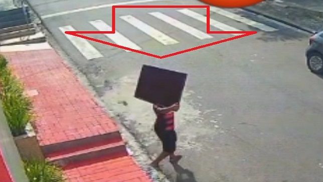 Momento que o criminoso vai embora do local levando o aparelho televisor nos ombros