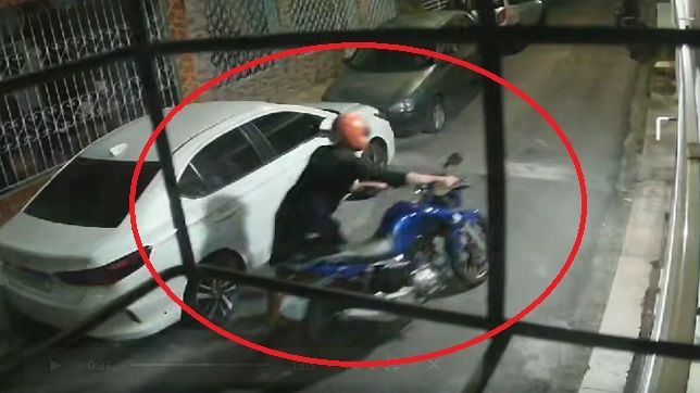 A câmera de segurança de uma residência filmou o momento que dois homens chegam ao local, um deles desce da garupa, se aproxima e com muita rapidez, consegue destravar a direção do veículo.