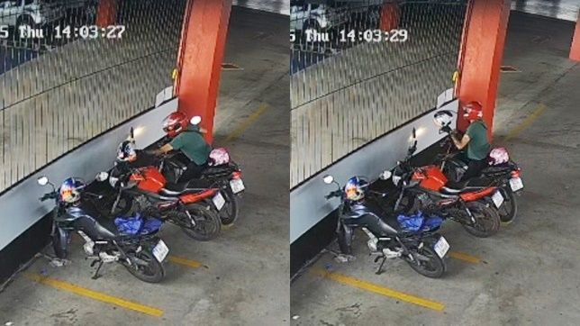 O bandido sabia que estava sendo filmado por isso usou capacete e encobriu a metade da placa da motocicleta, preta, que ele dirigia quando furtou o equipamento no estacionamento.