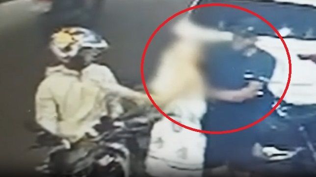 O vídeo não mostra imagens muito claras, pois estão embaçadas. No entanto, é possível ver o momento em que o homem ataca a mulher pelas costas, com puxões de cabelo.