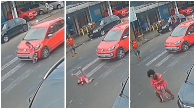 A criança corre, mas no meio do caminho é atropelada pelo carro, cai na pista e é socorrida pela mãe