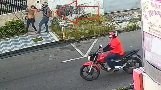 O assaltante junta a bolsa da jovem que havia caído no chão, corre de volta para a motocicleta dirigida por seu comparsa e quando está iniciando a fuga, ele ainda aponta a arma de fogo para a vítima.