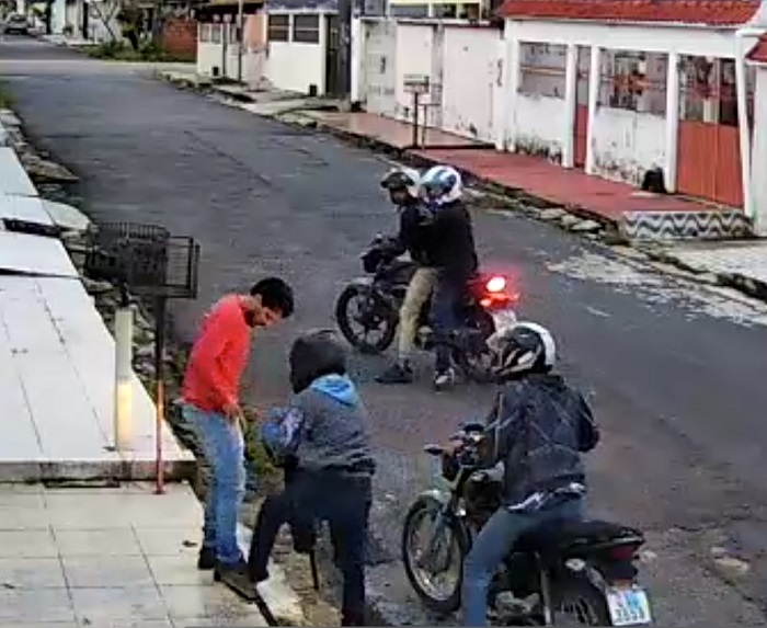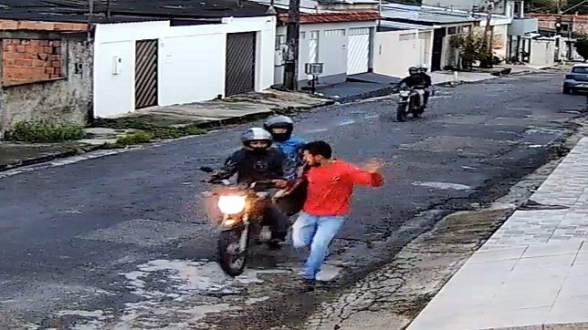 As câmeras de segurança de uma residência filmaram o momento que quatro assaltantes que estavam em duas motocicletas, perseguem a vítima que ainda tenta fugir correndo, mas acaba sofrendo a abordagem e tem o celular roubado.