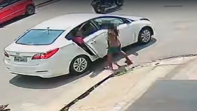 Momento que o carro para à margem da rua e a criança entra pela porta de trás e em plena luz do dia