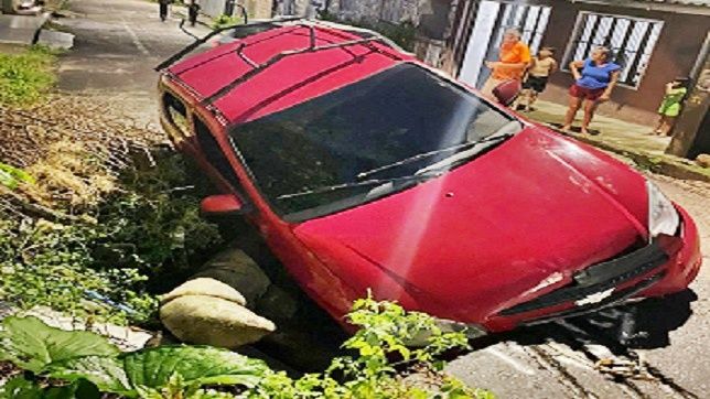 Um carro modelo Chevrolet, vermelho, placa não divulgada, caiu em uma cratera aberta na rua 24 de Junho, no bairro Colônia Terra Nova, Zona Norte de Manaus.