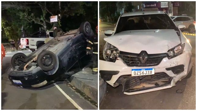 O carro modelo Chevrolet Fox, preto, placa KQK 0J99, capotou depois de colidir com um Renault Sandero, branco, placa QZS 6J38.