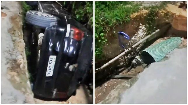 Os trabalhadores da concessionária não concluíram o serviço de tubulação, a obra foi deixada pela metade, e o motorista caiu com o carro no imenso buraco.