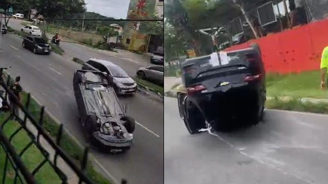 Um carro modelo Chevrolet Onix, preto, ocupado somente pelo motorista, capotou e ficou com as rodas para cima, na tarde desta quinta-feira, em frente ao Baratão da Carne, no bairro do Japiim, Zona Sul de Manaus.