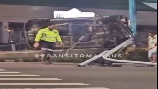 Um carro em alta velocidade, ficou desgovernado, subiu a rampa da plataforma de ônibus Expresso e ficou tombado, em um grave acidente que aconteceu na madrugada deste sábado, 17, na Avenida Max Teixeira, Zona Norte de Manaus.