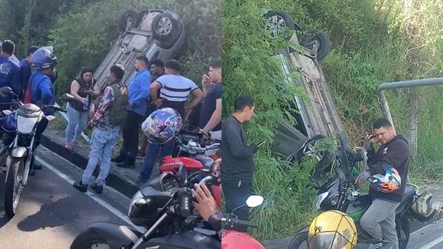 Depois de atingir uma placa de sinalização de trânsito, o veículo capotou e ficou de ponta-cabeça em um barrando cheio de mato à margem da artéria.