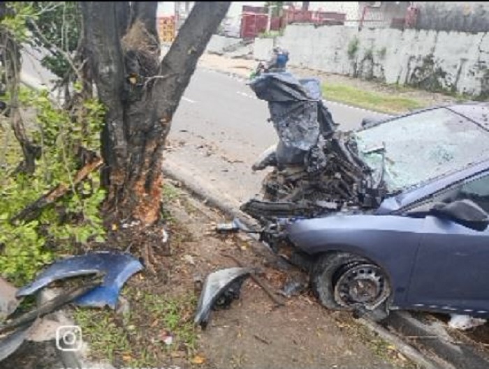 Um carro modelo Hyundai HB20, de cor azul, que ainda não teve a placa divulgada, colidiu violentamente com uma árvore na manhã deste domingo, 9, na Avenida Cosme Ferreira, Zona Leste de Manaus.