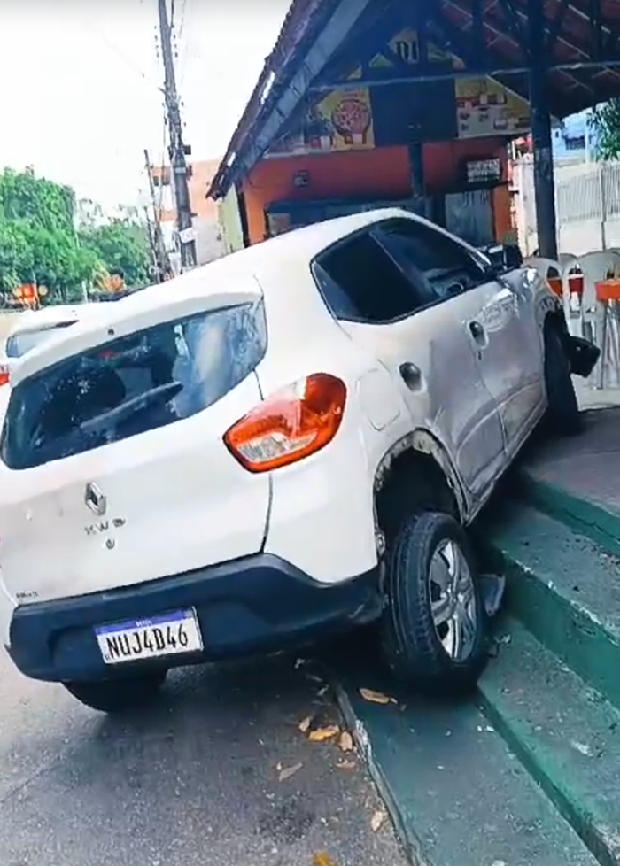 No vídeo aparece o Renault Kwid em cima dos degraus, com a lataria danificada no lado direito e mais atrás o outro carro, VW Gol, causador do acidente, parada bem próximo da viatura da 11ª Companhia Interativa Comunitária (Cicom).