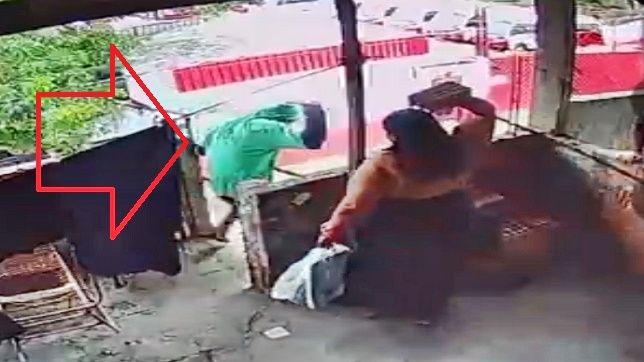 Momento que o bandido começa a fugir descendo a escada e a mulher atira tijolos em sua direção