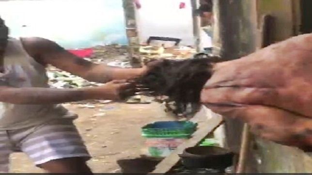 O acusado de roubo de celular é puxado pelos cabelos enquanto são aplicadas as pauladas em seu corpo