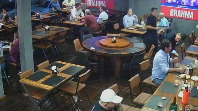 As imagens indicam que o ambiente estava tranquilo até o instante em que o garçom se aproxima da mesa, aparentemente para apresentar a conta. Logo em seguida, o cliente se levanta e acerta um tapa no rosto do funcionário.