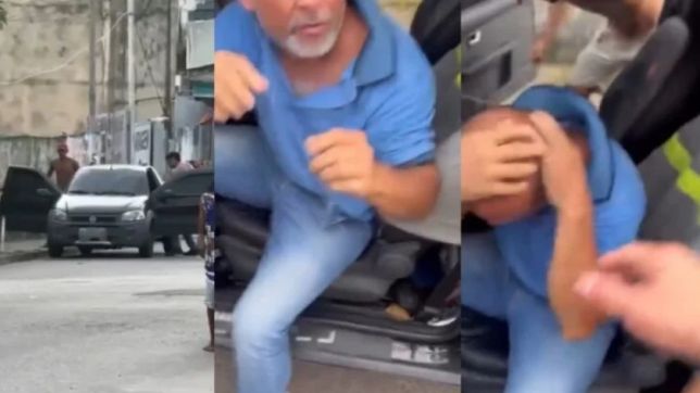 Nas imagens, três homens se aproximam e abrem as portas. Um deles começa a agredir o condutor, que teria chamado a vítima para participar do ato. Ela chamou o marido e junto com outras pessoas foi iniciado o espancamento.