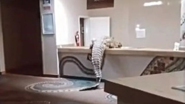 Segundo relatos, o réptil entrou tranquilamente no hotel, circulou por áreas comuns e chegou a tentar ultrapassar o balcão para alcançar a cozinha, possivelmente em busca de alimento.