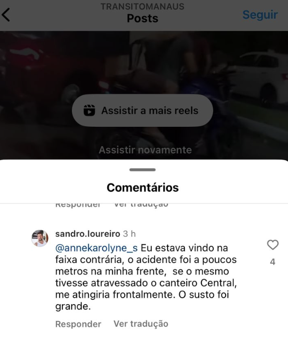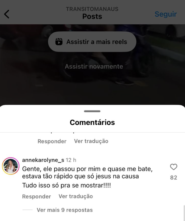 “Gente, ele passou por mim e quase me atingiu. Estava tão rápido que só Jesus na causa! Tudo isso para se exibir”, comentou a jovem Anne Karolyne em uma publicação do perfil Trânsito Manaus.