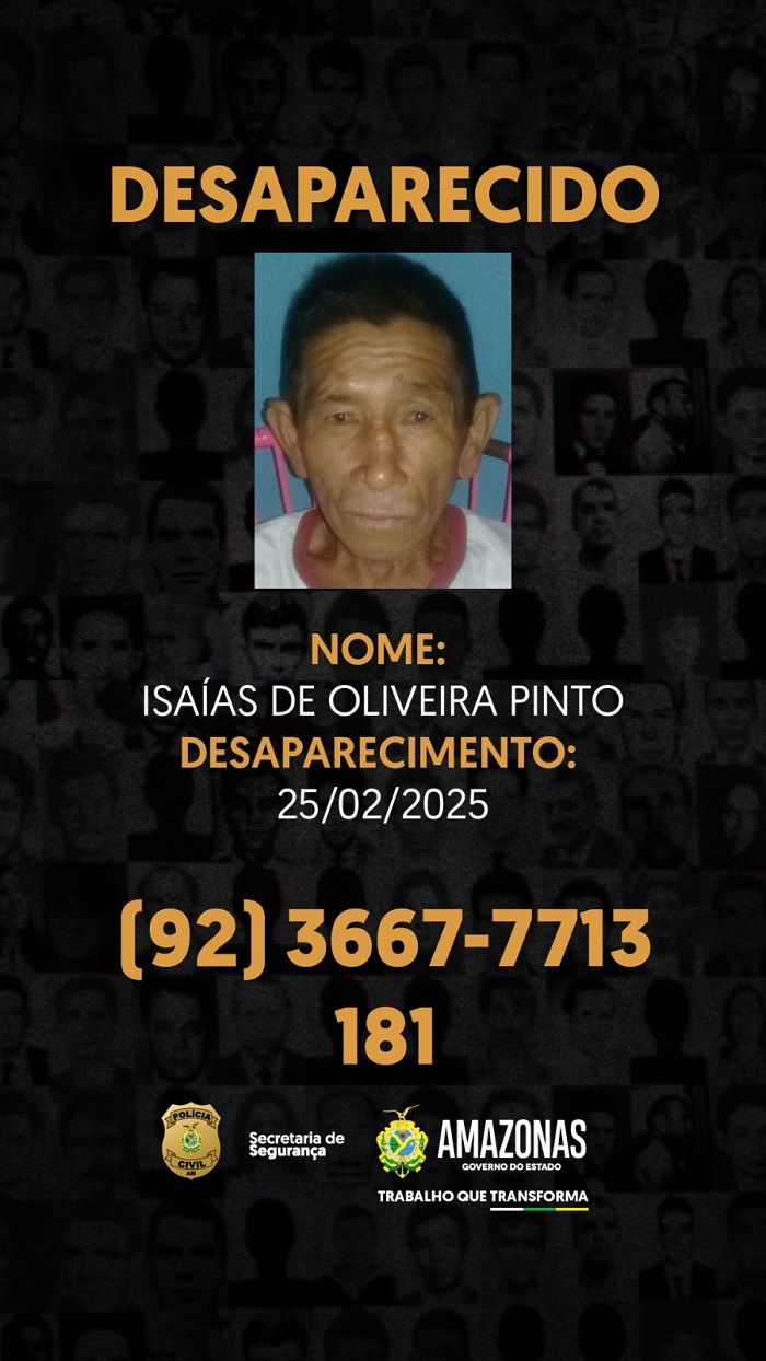 Quem tiver informações sobre o paradeiro do desaparecido, que entre em contato pelos seguintes números: (92) 3667-7713, da Deops; ou pelo 181, da Secretaria de Estado de Segurança Pública (SSP-AM).