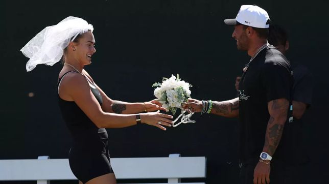 Sabalenka usa véu em torneio de tênis e recebe buquê do noivo brasileiro