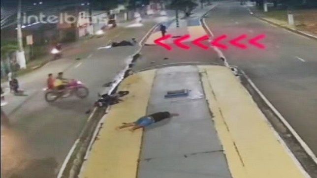 Um dos veículos é atingido na parte traseira, seu condutor é arremessado na pista, o corpo rola por alguns metros e fica jogado no canteiro central da artéria, como mostram as imagens divulgadas neste sábado.