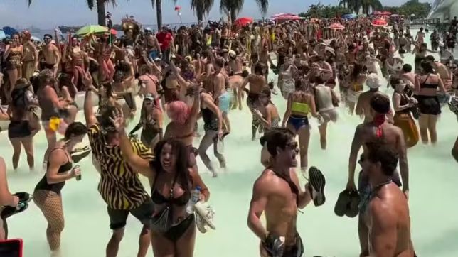 Foliões se refrescam no espelho d'água do Museu do Amanhã