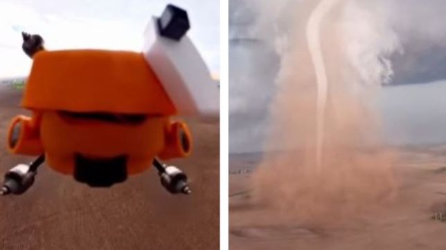 O equipamento foi lançado diretamente em direção ao tornado, enfrentando ventos extremamente fortes e condições adversas. As imagens mostram uma gigantesca coluna de ar em rotação, carregando poeira, destroços e objetos a alta velocidade. No interior do fenômeno, é possível observar uma espécie de “núcleo” turbulento, onde correntes de vento giram de forma caótica e intensa.
