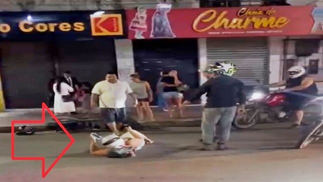 A mulher que está sendo massacrada só para de apanhar quando já está no chão e grita pedindo ajuda.