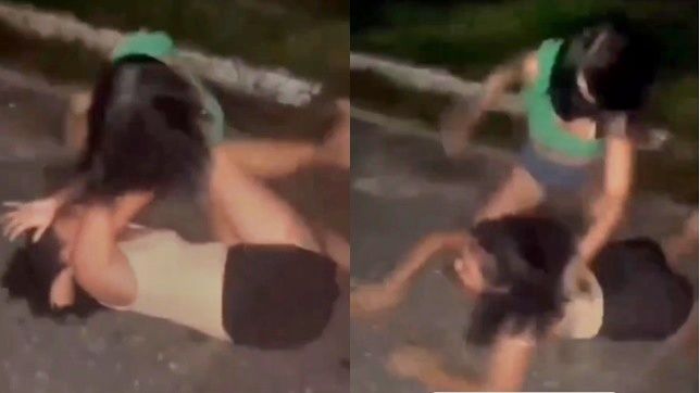 Duas mulheres aparecem em um vídeo travando violenta luta corporal, e uma delas, que está levando vantagem, aplica muitos socos no rosto e em outras partes do corpo da adversária.