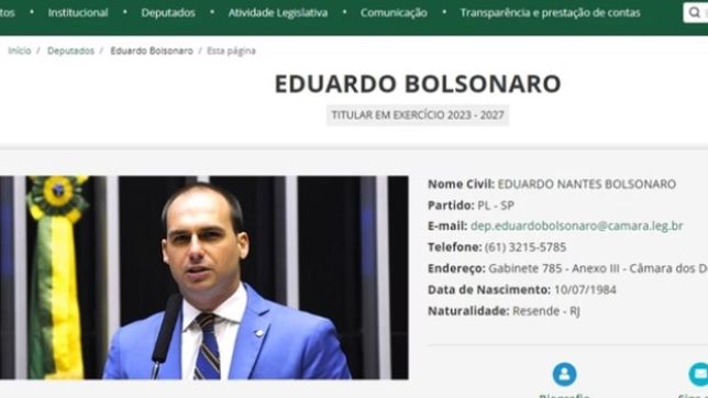 Site da Câmara dos Deputados já mostra Eduardo Bolsonaro (PL-SP) como titular em exercício do mandato, embora ele esteja nos EUA