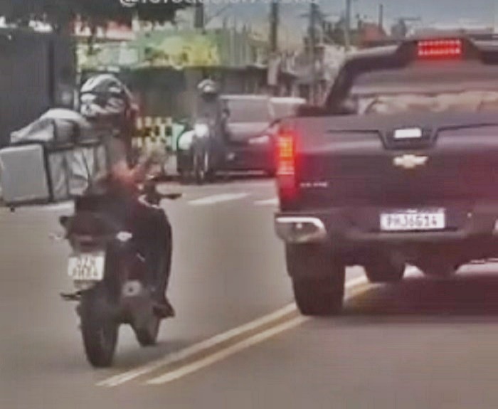 Um motociclista entregador de delivery arremessou uma pedra contra o vidro traseiro de uma picape modelo Hilux e provocou ferimento no rosto de uma passageira.