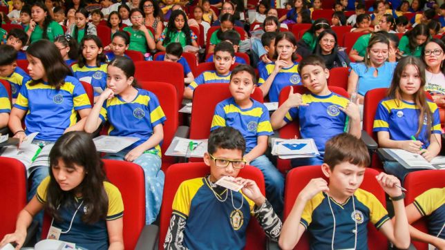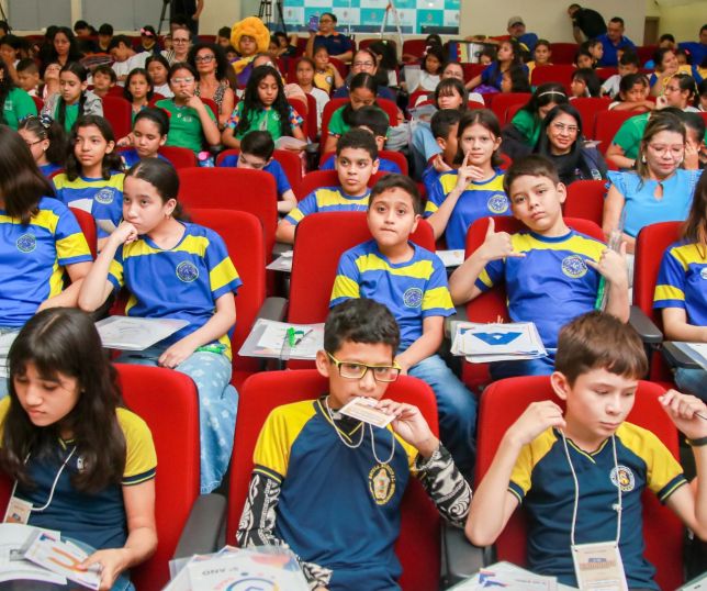 Muita animação, risos e interatividade marcaram o último “Viradão Saeb – Aula E+ Show”, com os estudantes do 5º ano do ensino fundamental da Prefeitura de Manaus, nesta segunda-feira, 13/10, no auditório da Secretaria Municipal de Educação (Semed), Zona Centro-Sul. O evento contou com a participação de aproximadamente 500 alunos, de 14 escolas, divididos entre manhã e tarde, que tiveram aulas de língua portuguesa e matemática. A aula também foi transmitida pelo YouTube no canal oficial da Semed.