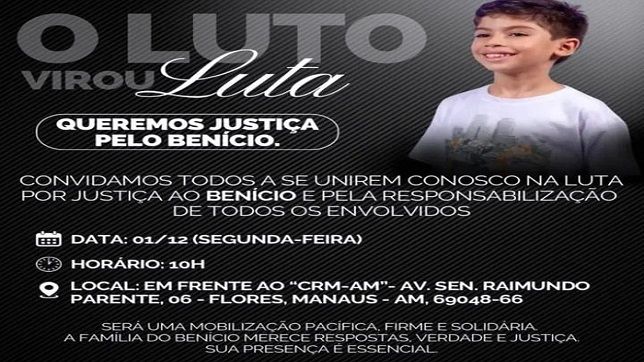 “O luto virou luta. Queremos justiça pelo Benício”, é o que está escrito na convocação divulgada nas redes sociais e grupos de WhatsApp, pelos pais do menino que foi vítima fatal de um erro médico, durante o atendimento no Hospital Santa Júlia, em Manaus.