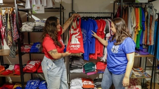 É na loja do empresário que a Juliana Landim, de 29 anos, e a Maysa Fagundes, de 29 anos, expõem os produtos da marca delas, voltada para camisetas, ecobags e lenços. De acordo com Juliana, a ideia de produzir algo específico sobre os bumbás surgiu junto com a retomada e crescimento da festa, em 2022.
