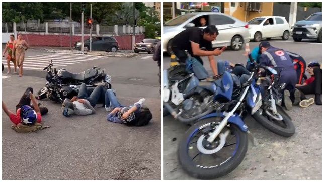 Uma violenta colisão entre duas motocicletas deixou quatro pessoas feridas e jogadas na pista no final da tarde desta segunda-feira, 28, no cruzamento das ruas Maceió com Salvador, no bairro de Adrianópolis, Zona Centro-Sul de Manaus.