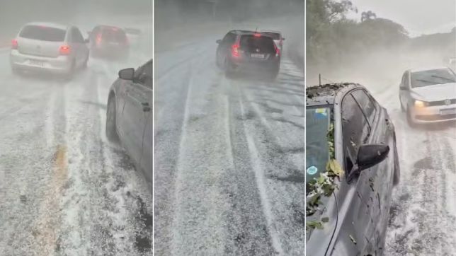 Imagens gravadas por condutores mostram o momento em que o granizo cai com intensidade e rapidamente cobre a rodovia, deixando o trecho praticamente intransitável. Em alguns pontos, a estrada ficou completamente branca, com veículos parados no acostamento aguardando melhora nas condições.