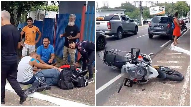 Populares ajudaram a retirar o motociclista do meio da avenida, foi levado para a calçada e o Serviçode Atendimento Móvel de Urgência (Samu) foi acionado.