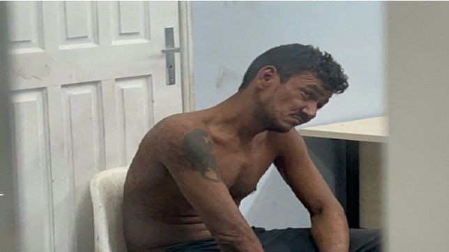 Foi preciso usar de força física para conter o homem furioso e após ser dominado e retirado o pedaço de pau de suas mãos foi algemado e colocado no xadrez da viatura.