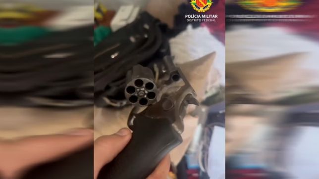 O vídeo mostra o momento em que os PMs encontraram o revólver debaixo de peças de roupas e as munições dentro de uma mochila.