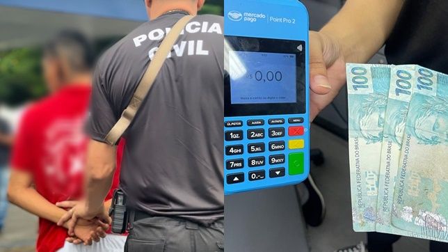 Durante a prisão do homem, a equipe policial encontrou 300 reais em cédulas falsas e uma máquina de cartão, confirmando o crime de estelionato.